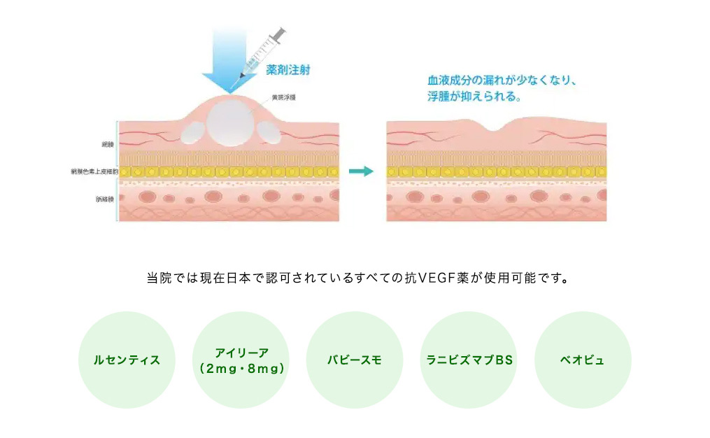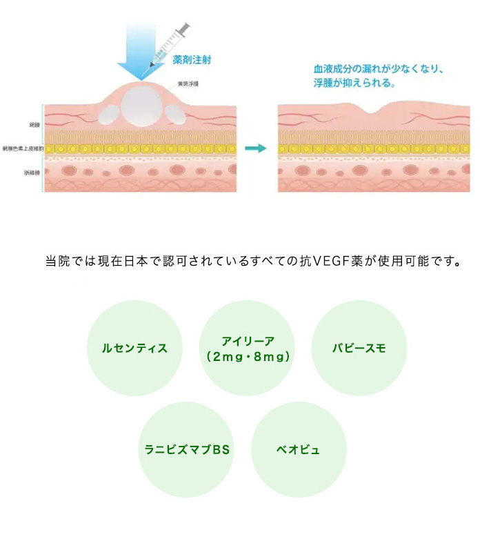 抗VEGF薬を注射することで、新生血管の活動を抑え、出血やむくみの改善が期待できます。