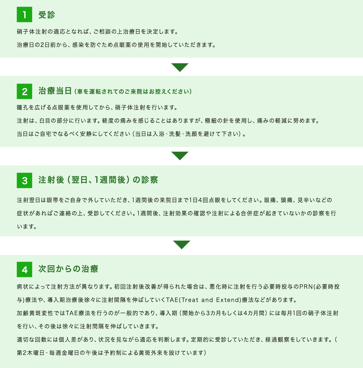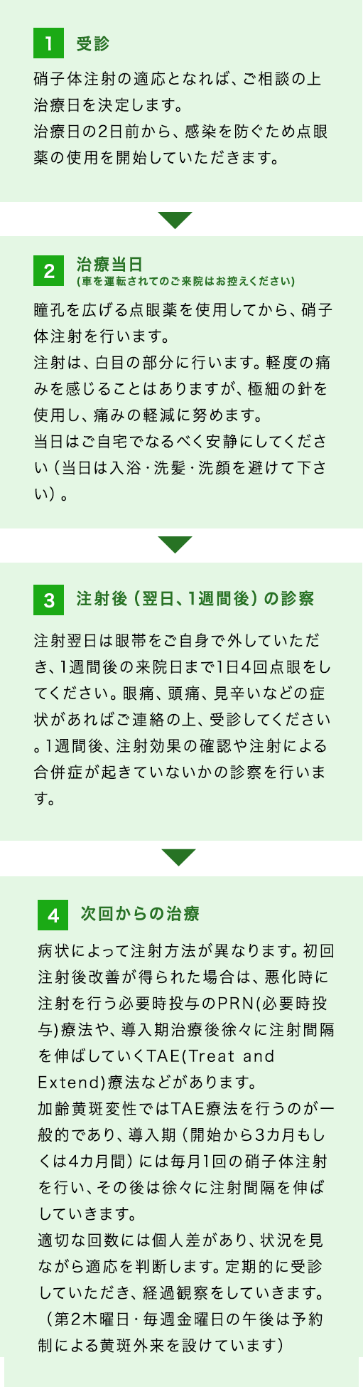 治療(注射)当日は、車・バイク・自転車の運転はできません。公共交通機関またはご家族の運転する車などでお越しください。公共交通機関をご利用の場合は、ご家族の付き添いをおすすめします。