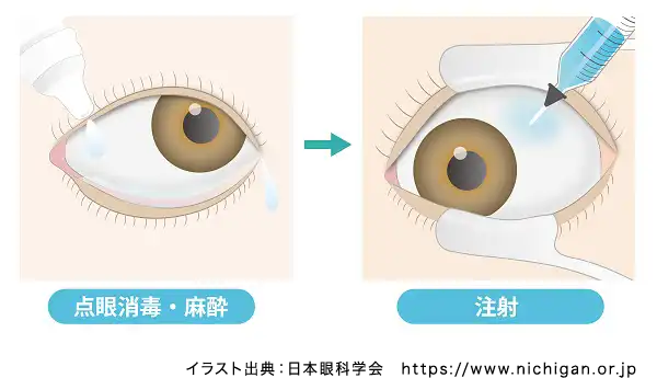 非常に稀ですが、注射時に細菌感染を起こす可能性があります。頻度は「数千回に1回」と言われていますが、感染予防のため、注射後は必ず抗菌薬の点眼を使用してください。